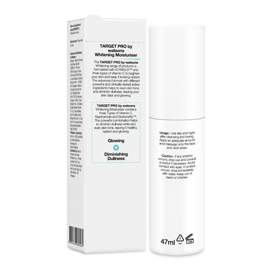 The Target Pro by Watsons Whitening range of products is formulated with three types of Vitamin C to brighten your skin and keep it looking radiant. The advanced formula with different powerful and clinically tested active ingredients helps to even skin tone and diminish dullness, leaving your skin clear and glowing. Target Pro by Watsons Whitening Moisturiser contains three Type of Vitamin C, Niacinamide and Biobenefity. This powerful combination helps to diminish dullness while also even skin tone, leaving it healthy, radiant and glowing. Suitable for normal and combination skin. Dermatologically tested. Made in Japan. Ingredient you can trust with a reduced environmental impact. This product was formulated without over 20 unwanted ingredients. Additionally, the paper used in this box packaging is certified by FSC.