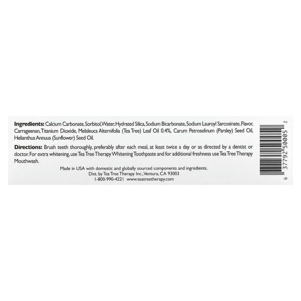 Полностью натуральная зубная паста с двойной системой очистки, карбонатом и бикарбонатом кальция. Масло чайного дерева терапевтического класса, обладающее природными антисептическими свойствами, контролирует бактерии, которые вызывают зубной налет и камень. Масло семян петрушки природным способом освежает дыхание. Попробуйте всю продукцию Tea Tree по уходу за полостью рта с экстрактом чайного дерева: зубную пасту, терапевтическую отбеливающую пасту и жидкость для полоскания рта. При комплексном использовании этих средств ваши зубы станут по-настоящему чистыми, десны — здоровыми, а дыхание всегда будет свежим!