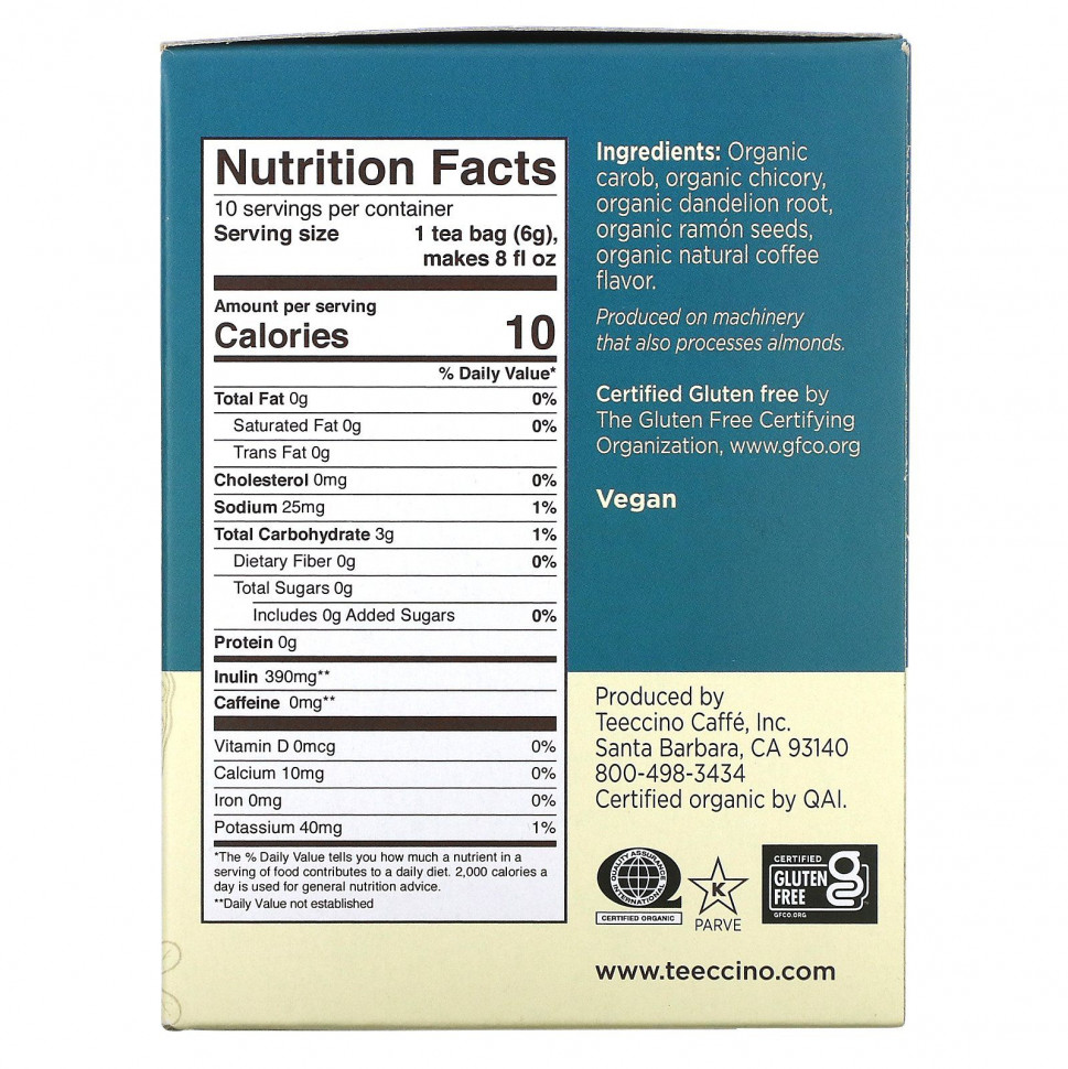 И любителям кофе, и любителям чая понравится приятный крепкий вкус Teeccino. Поклонники этого напитка считают, что вкус Teeccino более мягкий, более насыщенный и более сливочный по сравнению с кофе. В чем секрет? Французский цикорий, обжаренный корень, который часто добавляют в кофе, смешанный с одуванчиком, известной травой, которая используется для выведения токсинов, и испанским рожковым деревом, известным своим шоколадным вкусом. Благодаря бросимуму, из жареных семян которого майя готовят свой традиционный напиток, из Teecino получается восхитительный чай… или кофе? Попробуйте и решите сами!