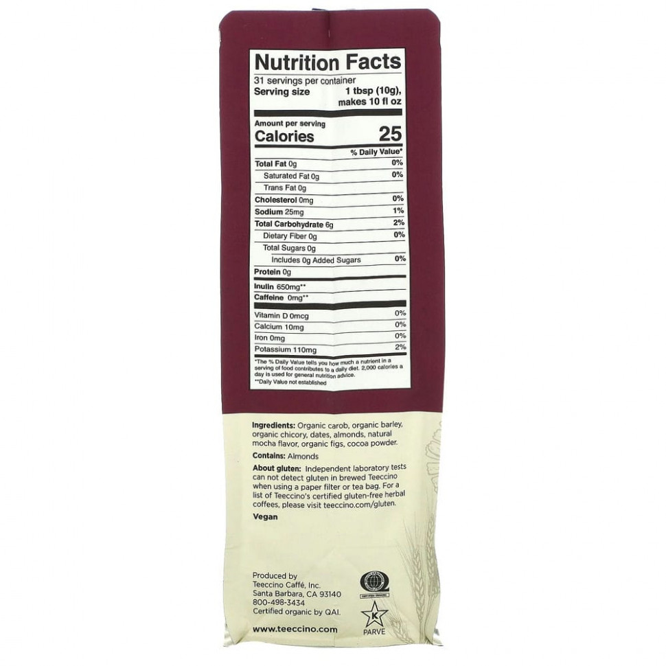 Наслаждайтесь восхитительно богатым, глубоко обжаренным вкусом Teeccino, дарящим удовольствие без кофеина и кислотности кофе! Узнайте, почему поклонники Teeccino считают этот напиток более мягким, насыщенным и сливочным, чем кофе. В чем секрет? Во французском цикории, обжаренном корне, который часто добавляют в кофе, смешанном с ячменем, любимым итальянским сортом без кофеина, и испанским рожковым деревом, известным своим шоколадным привкусом. Чашка Teeccino, насыщенная калифорнийским миндалем, финиками и инжиром, имеет множество преимуществ для здоровья.