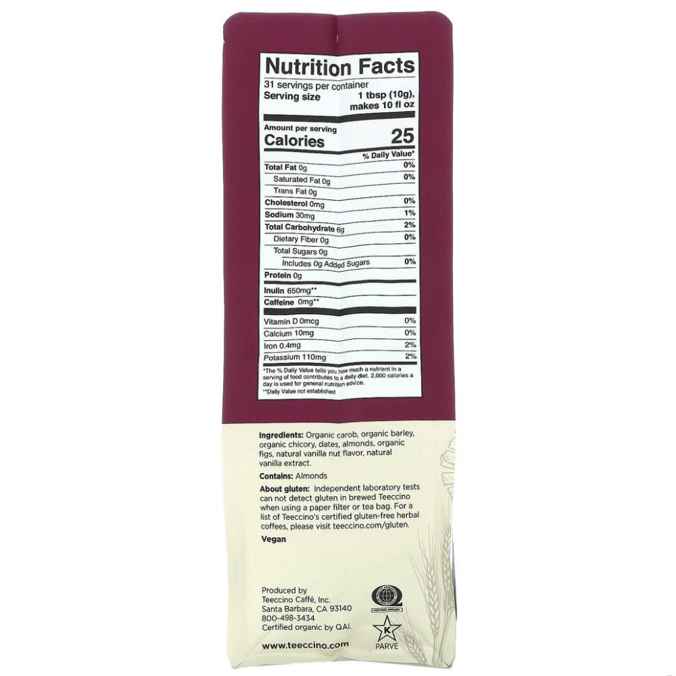 Наслаждайтесь восхитительно богатым, глубоко обжаренным вкусом Teeccino, дарящим удовольствие без кофеина и кислотности кофе! Узнайте, почему поклонники Teeccino считают его более мягким, насыщенным и сливочным, чем кофе. В чем секрет? Во французском цикории, обжаренном корне, который часто добавляют в кофе, смешанном с ячменем, любимым итальянским сортом без кофеина, и испанским рожковым деревом, известным своим шоколадным привкусом. Чашка Teeccino, насыщенная калифорнийским миндалем, финиками и инжиром, имеет множество преимуществ для здоровья.