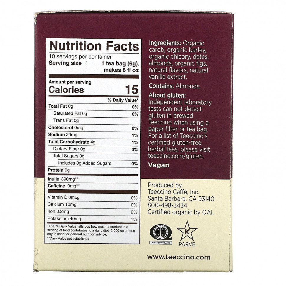 И любителям кофе, и любителям чая понравится приятный крепкий вкус Teeccino. Поклонники этого напитка считают, что вкус Teeccino более мягкий, более насыщенный и более сливочный по сравнению с кофе. В чем секрет? Во французском цикории, обжаренном корне, который часто добавляют в кофе, смешанном с ячменем, любимым итальянским сортом без кофеина, и испанским рожковым деревом, известным своим шоколадным привкусом. Входящие в состав калифорнийский миндаль, финики и инжир превращают напиток Teeccino в восхитительную чашку чая… или кофе? Попробуйте и решите сами!