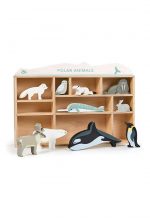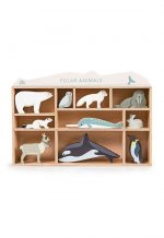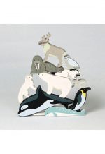 Our endangered animals from the two frozen poles.Presented in a shelving unit, solid wood animals — orca, narwhal, snow hare, arctic fox, king penguin, owl, white stoat, walrus, an elk and of course a polar bear.