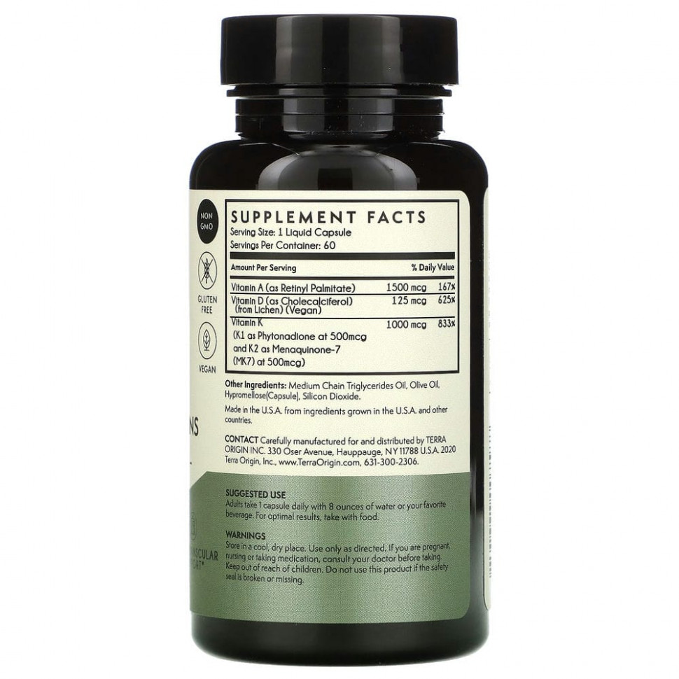 Незаменимые витамины Terra Origin ADK, специально разработанные с использованием высококачественных нутрицевтиков, представляют собой веганскую ежедневную добавку без ГМО, которая укрепляет и поддерживает ваши кости, сердце и иммунную систему. Эта высокоэффективная смесь витаминов A, D и K упакована в жидкую капсулу с маслом MCT, которая способствует выработке клеток, поглощению кальция из кровотока в кости, укреплению плотности костей и поддержке сердечно-сосудистой системы.
