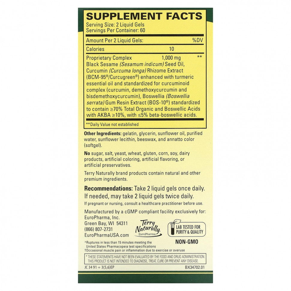 Запатентованный комплекс Масло семян черного кунжута (Sesamum indicum), экстракт корневища куркумина (Curcuma longa) (BCM-95® / Curcugreen®), обогащенный эфирным маслом куркумы и стандартизированный по куркуминоидному комплексу (куркумин, деметоксикуркумин и бисдеметоксикуркумин), босвеллии (Boswellia serrata) Экстракт (BOS-10®), стандартизированный до содержания 270% всего органических и босвеллиевых кислот с AKBA >,10%, с <,5% бета-босвеллиевые кислоты. |