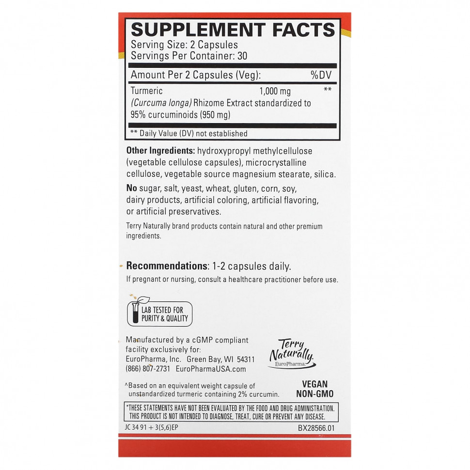 Куркума (Curcuma longa) Экстракт корневища, стандартизированный до 95% куркуминоидов (950 мг) |