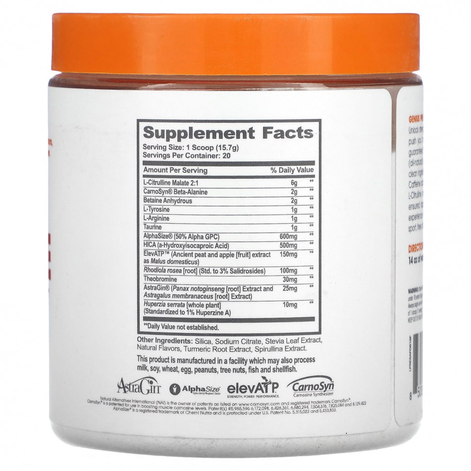 Genius pre — это полностью натуральный предтренировочный комплекс без стимуляторов и ноотропов. Раскройте силу и мощь, которые позволят вам выйти за пределы необработанных возможностей и подтолкнуть вас к новым уровням мастерства. Ваши физические возможности гарантированно расширяются, если ваш мозг использует правильные (полностью натуральные) питательные вещества, а ваши мышцы стимулируются научно доказанными чистыми ингредиентами. Не зря. С научной точки зрения кофеин действительно снижает кровоток. С клинической дозой 6 граммов L-цитруллина малата, бета-аланина и АТФ вы гарантированно быстро избавитесь от повышенного уровня. Перейдите в режим полной накачки мышц, чтобы повысить выносливость и ускорить восстановление. Продукт Genius прошел предварительное тестирование на предмет пригодности для занятий спортом, не содержит запрещенных веществ.