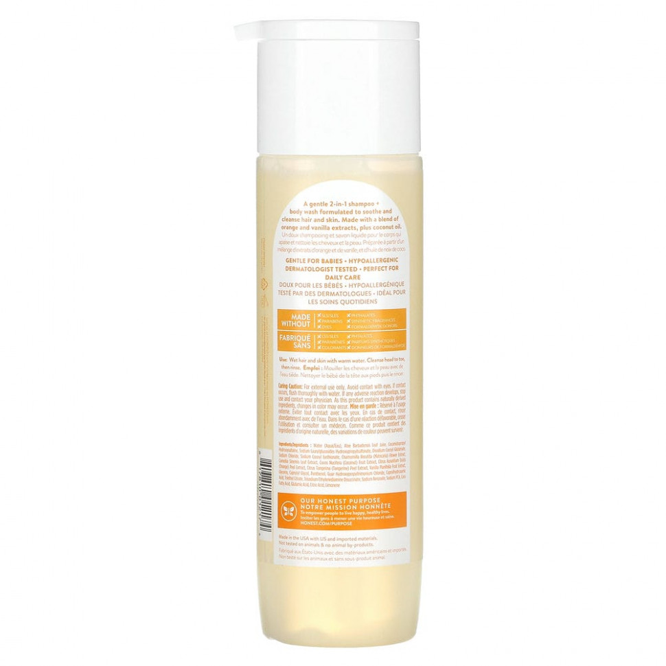 Нежный шампунь 2 в 1 + гель для душа, разработанный для успокоения и очищения волос и кожи. Изготовлено из экстрактов апельсина и ванили, а также кокосового масла.