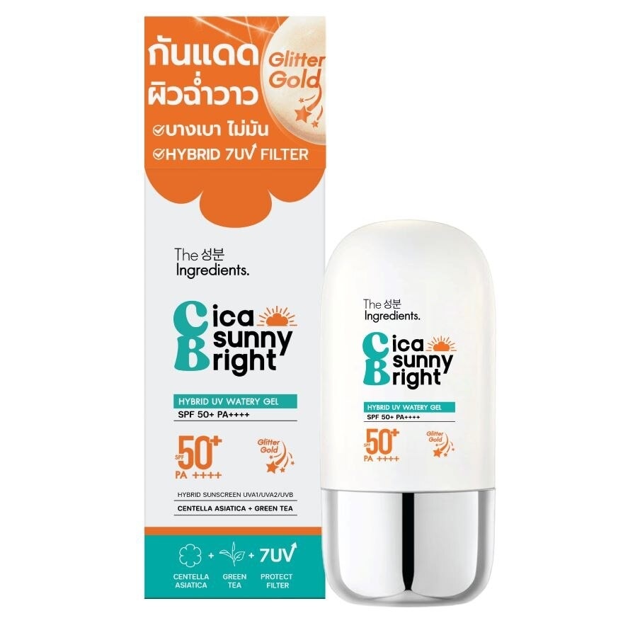 THE INGREDIENTS CICA SUNNY BRIGHT HYBRID UV WATERY GEL SPF 50+ PA++++ This watery hybrid sun gel was developed for all skin types and provides advanced protection against UVA I II and UVB from 7 UV filters. Adding Gold Glitter to Make your skin Glow and shine. 4 Free : Alcohol/ Fragrance / Mineral oil/ Paraben No white cast, suitable for sensitive skin and all color skin.