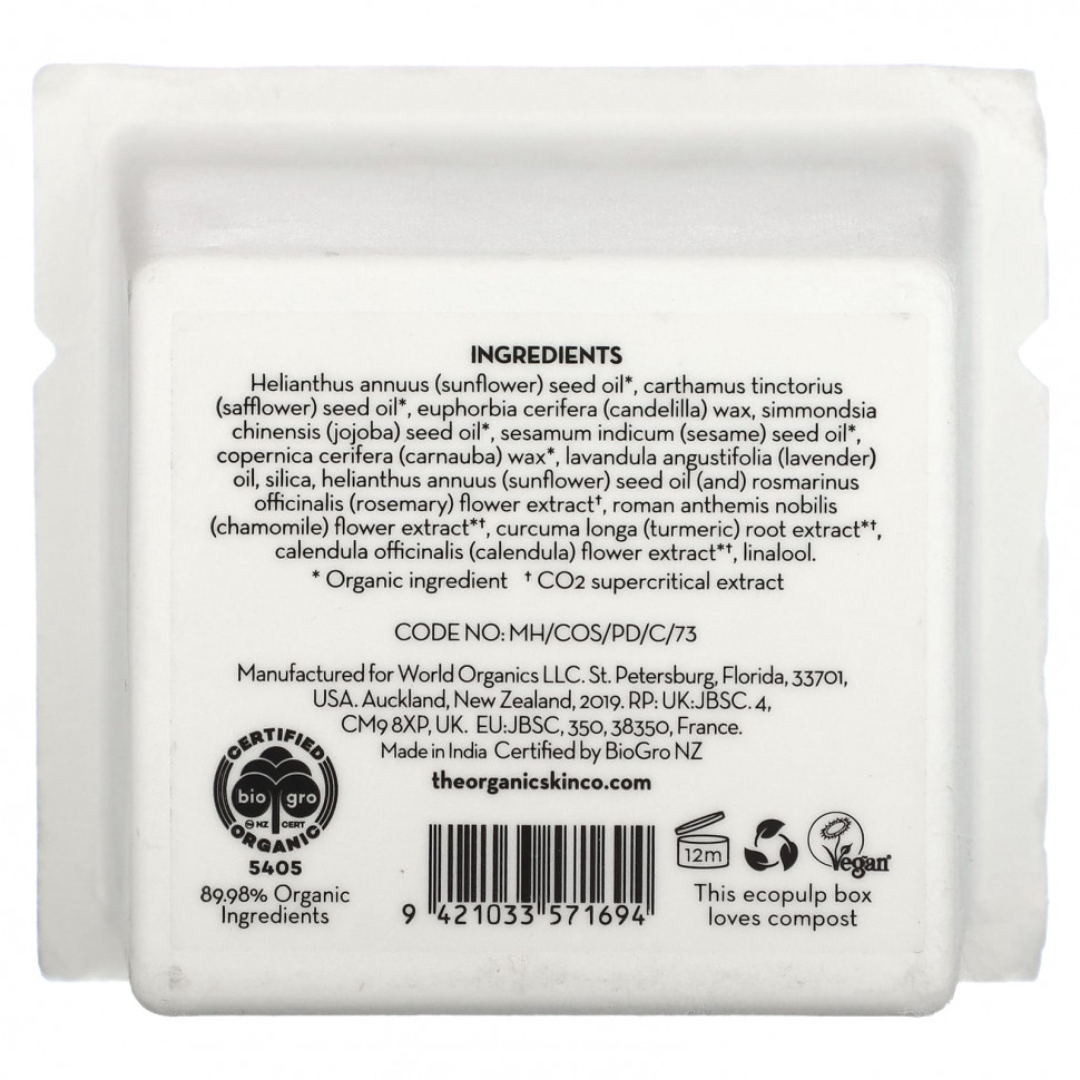 Подсолнечное масло (Helianthus annuus)*, масло семян сафлора (Carthamus tinctorius)*, канделильский воск (Euphorbia cerifera), масло семян жожоба (Simmondsia chinensis)*, кунжутное масло (Sesamum indicum)*, карнаубский воск (Copernica cerifera) *, лавандовое масло (Lavandula angustifolia), диоксид кремния, масло семян подсолнечника (Helianthus annuus) и экстракт цветков розмарина (Rosmarinus officinalis) †, экстракт цветков ромашки (roman anthemis nobilis) * †, экстракт корня куркумы (Curcuma longa) * †, экстракт цветков календулы (Calendula officinalis) * †, линалоол.
