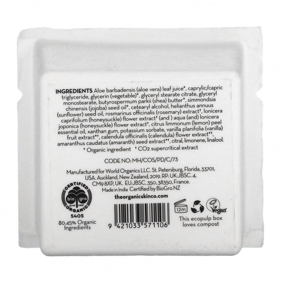 Сок листьев алоэ вера (Aloe barbadensis)*, каприловый/каприновый триглицерид, глицерин (растительный) *, глицерил стеарат цитрат, глицерил моностеарат, масло ши (Butyrospermum parkii)*, масло семян жожоба (Simmondsia chinensis)*, цетеариловый спирт, подсолнечное масло (Helianthus annuus), экстракт розмарина (Rosmarinus officinalis) †, экстракт цветков жимолости (Lonicera caprifolium) † (и) экстракт цветков водоросли (и) жимолости (Lonicera joponica) †, эфирное масло из цедры лимона (Citrus limmonum), ксантановая камедь, сорбат калия, экстракт плодов ванили (Vanilla planifolia) * †, экстракт цветков календулы (Calendula officinalis) * †, экстракт семян амаранта (Amaranthus caudatus) * †, цитраль, лимонен, линалоол.