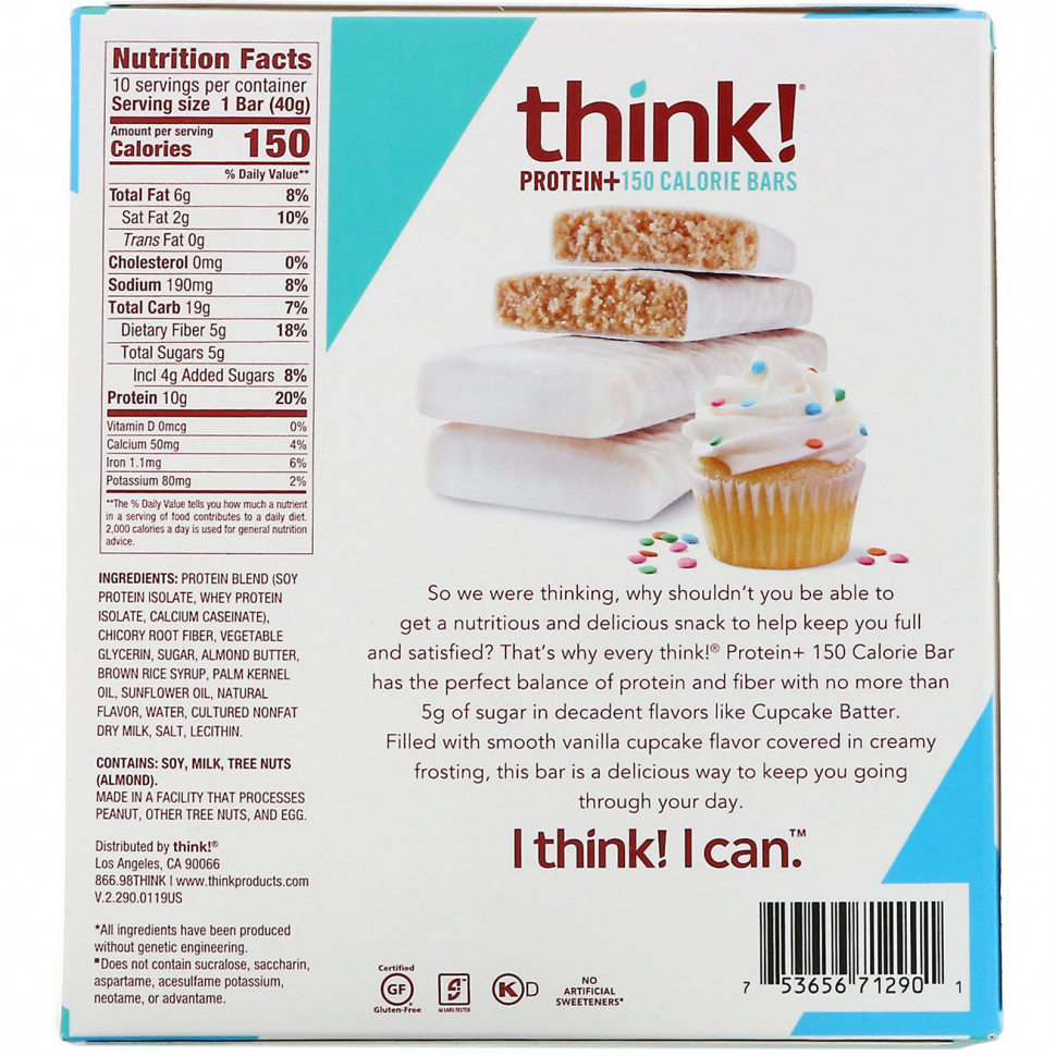 Мы подумали, что вам пригодился бы вкусный и питательный перекус, помогающий утолить голод и получить заряд энергии. Вот почему каждый батончик Think! Protein+ энергетической ценностью 150 калорий обладает безупречным балансом белка и клетчатки, а потрясающие ароматизаторы, такие как Cupcake Batter, содержат не более 5 г сахара. Мягкий вкус ванильного кекса, покрытого кремовой глазурью, делает эти батончики вкусным способом подкрепить свои силы во время трудного дня.