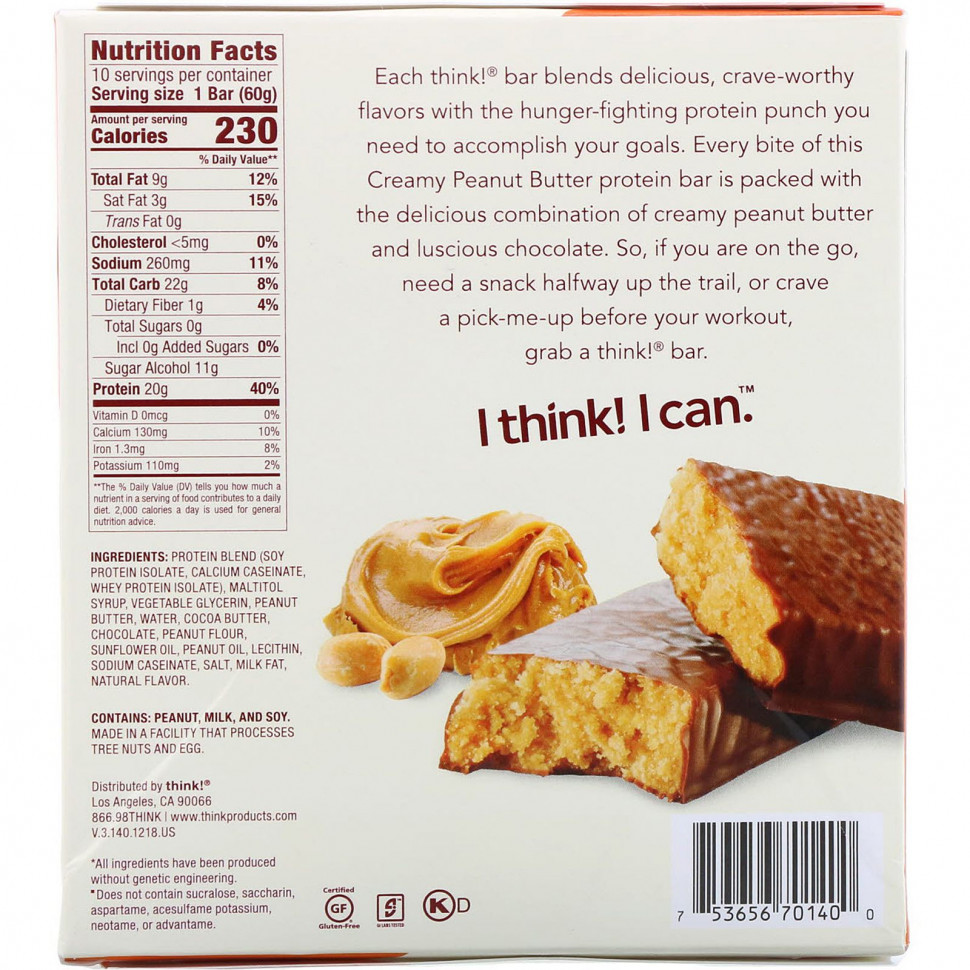Каждый батончик think! содержит смесь аппетитных вкусовых добавок и сытного белка, которые дают ощутить прилив энергии, необходимой для достижения поставленных целей. Каждый кусочек этого протеинового батончика Creamy Peanut Butter наполнен восхитительной комбинацией сливочного арахисового масла и вкуснейшего шоколада. Так что захватите с собой батончик think!, если хотите перекусить по дороге или вам необходим заряд бодрости перед тренировкой.