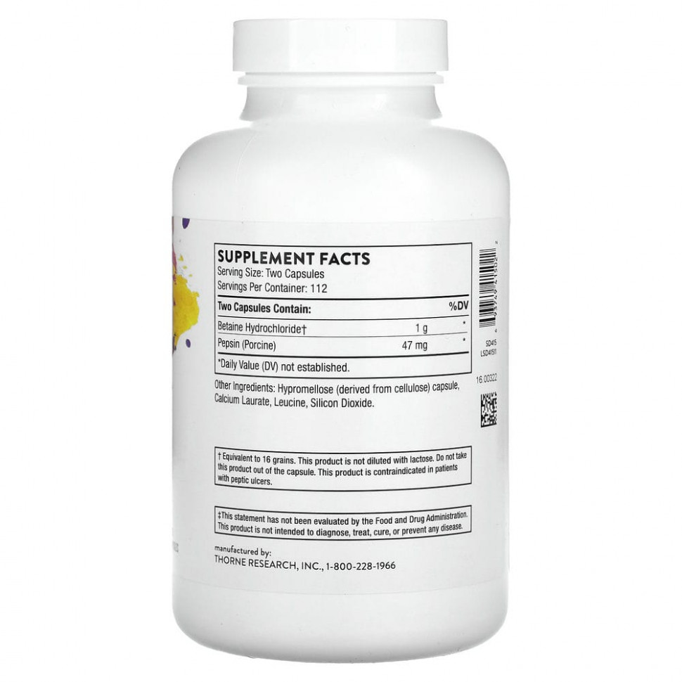 Расстройство желудка может быть вызвано многими причинами, в том числе недостаточным количеством хлористоводородной кислоты в желудке. Секреция хлористоводородной кислоты оказывает комплексное положительное воздействие. Она способствует усвоению белка путем активации пепсиногена в пепсин, защищает желудок от проникновения поглощаемых патогенных микроорганизмов, ингибирует нежелательный излишний рост в тонкой кишке и стимулирует поступление желчи и панкреатических ферментов. Хлористоводородная кислота также способствует усвоению ряда питательных веществ, включая фолат, витамин B12, аскорбиновую кислоту, бета-каротин, железо и некоторые формы кальция, магния и цинка. Многочисленные исследования показали, что секреция хлористоводородной кислоты в желудке начинает снижаться с возрастом. Злоупотребление антацидами или кислотными блокаторами также может привести к низкому уровню хлористоводородной кислоты в желудке, что может послужить причиной плохого усвоения белка. В добавке Thorne используются бетаингидрохлорид и пепсин свиного происхождения.