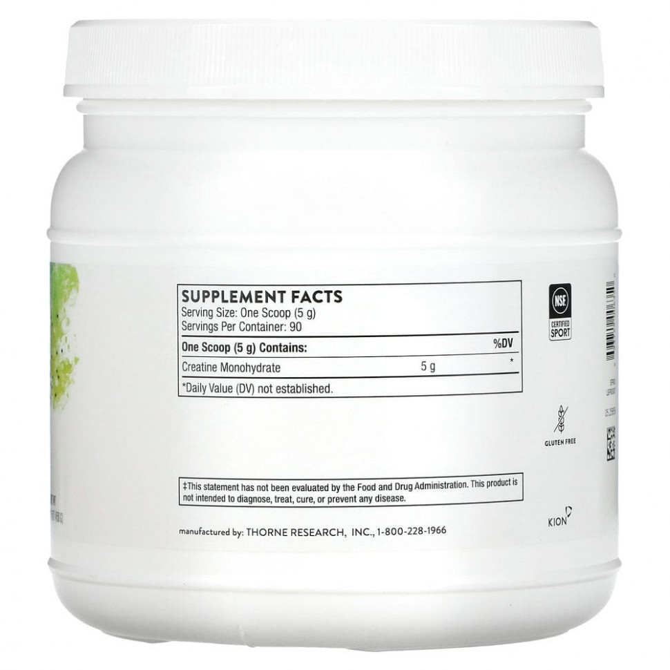 Аминокислота креатин естественным образом вырабатывается организмом из других аминокислот, а также содержится в таких продуктах, как мясо, яйца и рыба. Thorne предлагает креатин в виде Creapure — микронизированного моногидрата креатина, не содержащего красителей и отдушек и отличающегося повышенной растворимостью.
