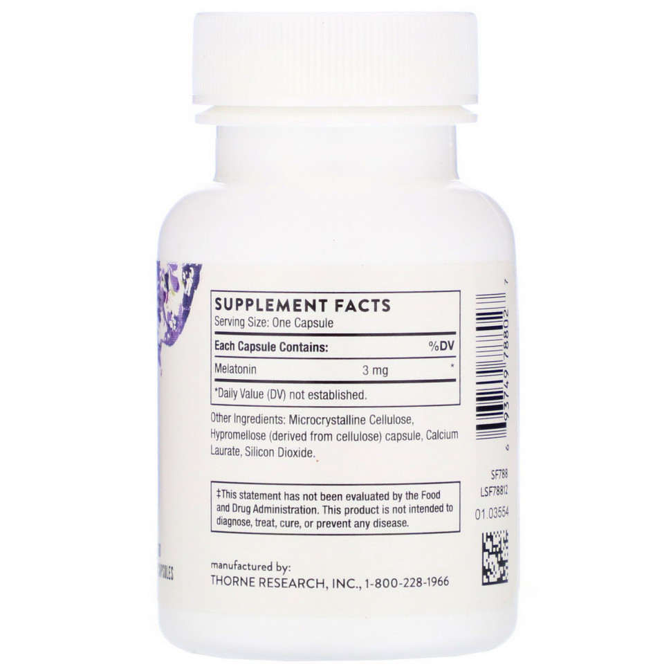 Было доказано, что прием мелатонина в дозах от 0,3 до 5,0 мг оказывает седативное действие. При приеме добавки до начала нормальной секреции мелатонина в организме даже небольшое количество мелатонина может способствовать сну. Мелатонин, по-видимому, усиливает действие гамма-аминомасляной кислоты (ГАМК) через прямое взаимодействие с рецепторами ГАМК, что приводит к расслаблению. Melaton-3 от Thorne содержит три мг мелатонина в каждой капсуле, а Melaton-5 содержит 5 мг на капсулу и используется, когда требуется более высокое количество мелатонина. Мелатонин также обладает значительной антиоксидантной активностью. Сообщается, что адекватный уровень мелатонина является положительным фактором для здоровья сердечно-сосудистой системы, нейроэндокринной системы, желудочно-кишечного тракта и костей.
