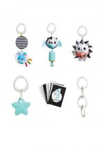 This gift set contains 4 selected toys for on the go that encourage your baby’s development and provide a fun play experience. Marie, the musical hedgehog, reacts with music to keep smaller babies busy and teach older babies the principle of cause and effect.