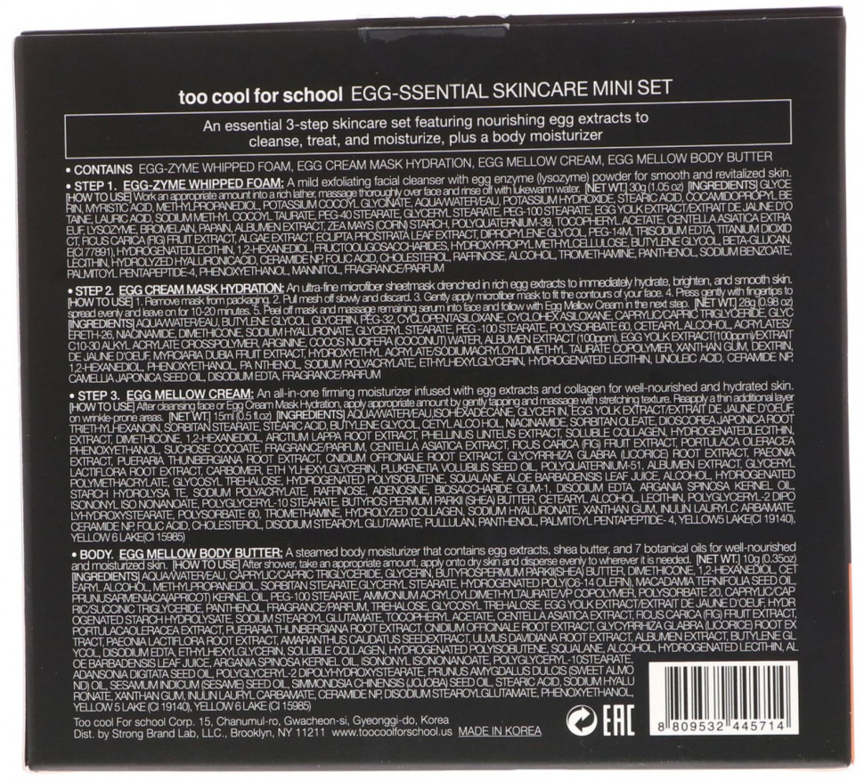 Упаковка содержит Взбитая пена с яичным кремом, яичная крем-маска для увлажнения, яичный крем для тела, яичное масло для тела