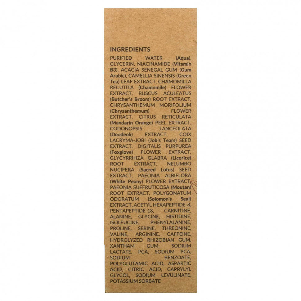 Очищенная вода, глицерин, никотинамид (витамин B3), сенегальская камедь (аравийская камедь), экстракт листьев зеленого чая (Camellia sinensis), экстракт цветков ромашки (Chamomilla recutita), экстракт корня иглицы (Ruscus aculeatus), экстракт цветков хризантемы (Chrysanthemum morifolium), экстракт цедры мандарина (Citrus reticulata), экстракт кодонопсиса ланцетного (деодеок), экстракт семян журавля (Coix lacryma-jobi), экстракт цветков наперстянки (наперстянки), экстракт корня солодки (Glycyrrhiza glabra), экстракт семян лотоса священного (Nelumbo nucifera), экстракт цветков белого пиона (Paeonia albiflora), экстракт тюленя соломона (Polygonatum odoratum), ацетил гексапептид-8, пентапептид-18, карнитина, аланин, глицин, гистидин, изолейцин, фенилаланин, пролин, серин, треонин, валин, аргинин, кофеин, гидролизованная ризобиевая камедь, ксантановая камедь, лактат натрия, пирролидон-карбоновая кислота, натрия пирролидонкарбонат, бензоат натрия, полиглутаминовая кислота, аспарагиновая кислота, лимонная кислота, каприлилгликоль, левулинат натрия, сорбат калия.