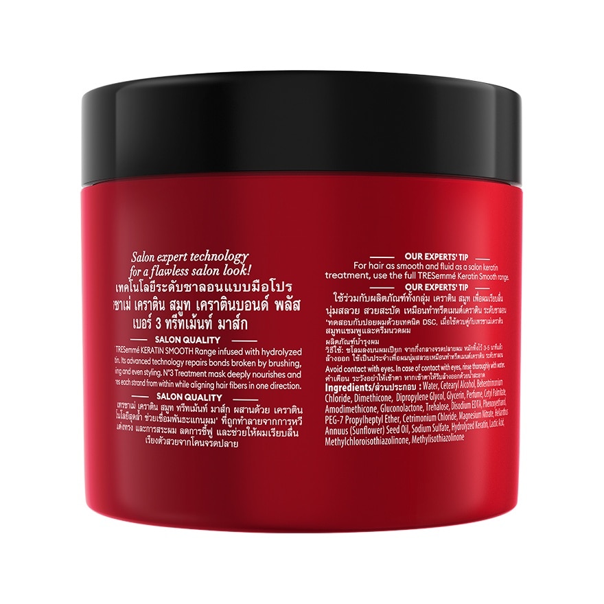 TRESemme KERATIN SMOOTH TREATMENT MASK infused with hydrolyzed keratin. Its advanced technology repairs bonds broken by brushing, washing and even styling. No.3 Treatment mask deeply nourishes and restores each strand from within while aligning hair fibers in one direction. -OUR EXPERTS’ TIP For hair as smooth and fluid as a salon keratin treatment, use the full TRESemme Keratin Smooth range. After washed rub the products on your hair thoroughly leave for 3-5mins then rinse off. Use regularly for salon smooth hair. TRESemme KERATIN SMOOTH TREATMENT MASK infused with hydrolyzed keratin. Its advanced technology repairs bonds broken by brushing, washing and even styling. No.3 Treatment mask deeply nourishes and restores each strand from within while aligning hair fibers in one direction.