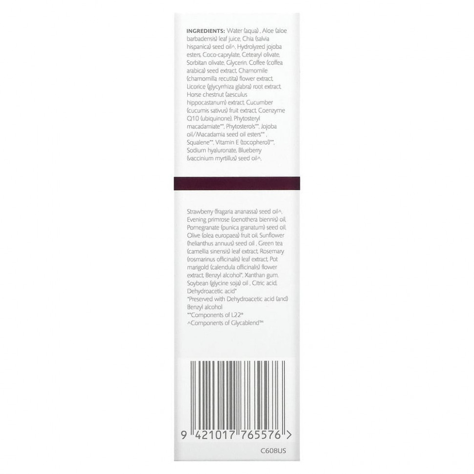 Восстанавливающий супер-ингредиент L22® помогает улучшить внешний вид кожи, ингредиент Glycablend ® помогает поддерживать эластичность и целостность кожи. Гиалуроновая кислота растительного происхождения улучшает упругость, кофеин и CoQ10 тонизируют, а алоэ вера охлаждает кожу.