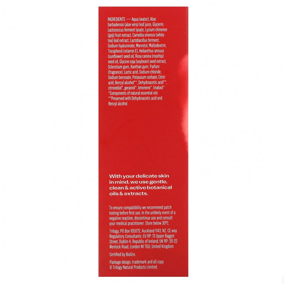 Вода (Aqua), сок листьев алоэ вера (Aloe barbadensis), глицерин, лизат ферментов лактококка, экстракт плодов годжи (Lycium chinense), экстракт листьев белого чая (Camellia sinensis), фермент лактобактерий (Lactobacillus), гиалуронат натрия, маннит, мальтодекстрин, токоферол (витамин Е), подсолнечное масло (Helianthus annuus), масло из семян шиповника (Rosa canina), экстракт соевых бобов (Glycine soja), смола склероций, ксантановая камедь, парфюмерная композиция (отдушка), молочная кислота, хлорид натрия, бензоат натрия, сорбат калия, лимонная кислота, бензиловый спирт **, дегидроуксусная кислота **, цитронеллол *, гераниол *, лимонен*, линалоол*.