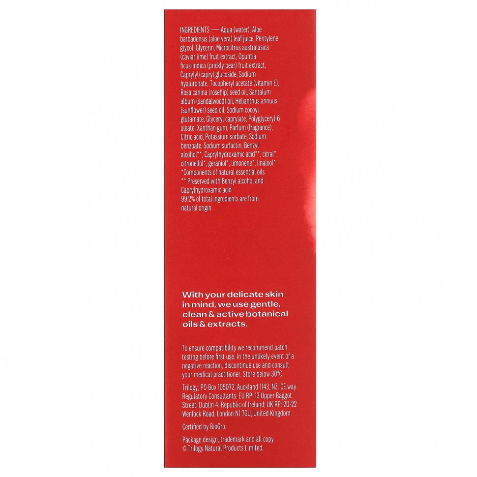 Вода (Aqua), сок листьев алоэ вера (Aloe barbadensis), пентилен гликоль, глицерин, экстракт плодов икры австраласской (Microcitrus australasica), экстракт плодов опунции (Opuntia ficus-indica), каприлил/каприл глюкозид, гиалуронат натрия, токоферилацетат (витамин E), масло из семян шиповника (Rosa canina), масло сандалового дерева (Santalum album), подсолнечное масло (Helianthus annuus), кокоил глутамат натрия, глицерил каприлат, полиглицерил-6-олеат, ксантановая камедь, парфюмерная композиция (отдушка), лимонная кислота, сорбат калия, бензоат натрия, сурфактин натрия, бензиловый спирт **, каприлгидроксамовая кислота **, цитраль *, цитронеллол *, гераниол *, лимонен*, линалоол*.