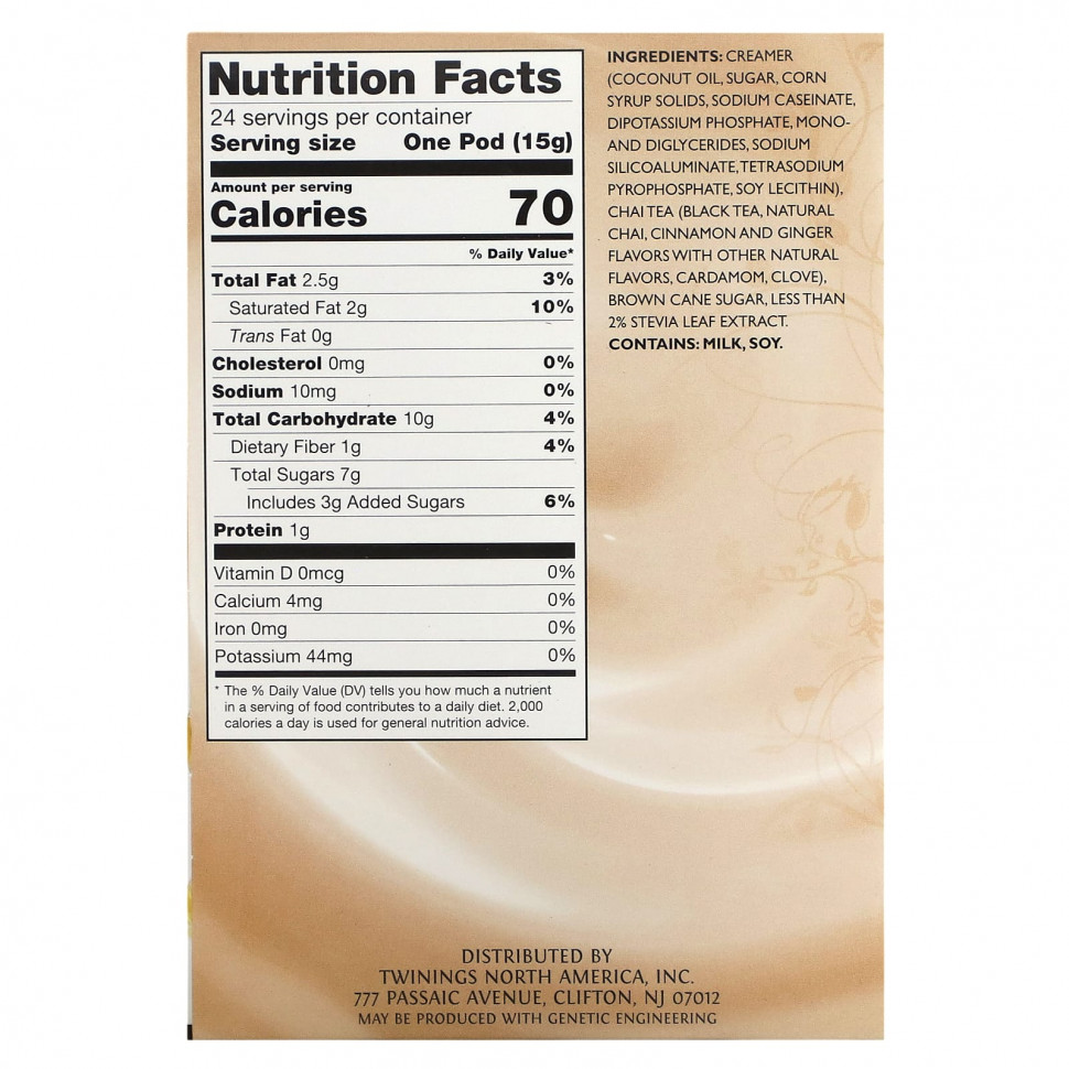 Сливки (кокосовое масло, сахар, сухая кукурузная патока, казеинат натрия, дикалийфосфат, моно- и диглицериды, силикоалюминат натрия, тетранатрия пирофосфат, соевый лецитин), чай (черный чай, натуральный чай, корица и имбирь с другими натуральными ароматизаторами, кардамон, гвоздика), коричневый тростниковый сахар, менее 2% экстракта листьев стевии.