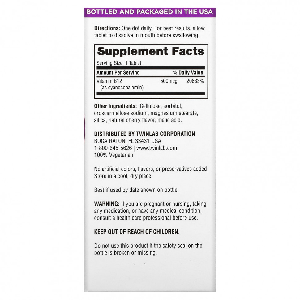 Twinlab® B12 Dots ™ — это специально разработанные микротаблетки, которые быстро растворяются во рту и содержат 500 мкг витамина B12 в каждой таблетке с восхитительным вкусом вишни.