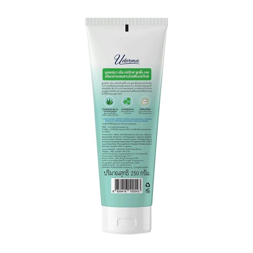 Uderma Aloe Peptide Soothing Gel smoothes the look of fine lines while moisture skin from dryness for a more youthful look. It is formulated to soothe and cooling benefits to the skin from sun exposure and air pollution with 99.7 pure natural aloe leaf juice. Also, calming skin irritation and reducing the appearance of redness by Centella Asiatica Extract and Allantoin. The nourishing gel are combined with especially potent protein peptide which helps supporting to process to produce hyaluronic acid, collagen and elastin to target the signs of aging by visibly boosting radiance and nourish skin for youthfulness.