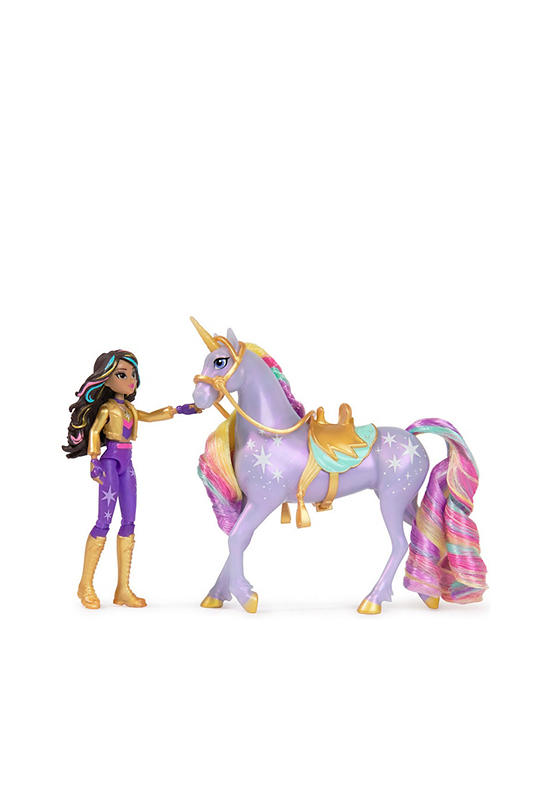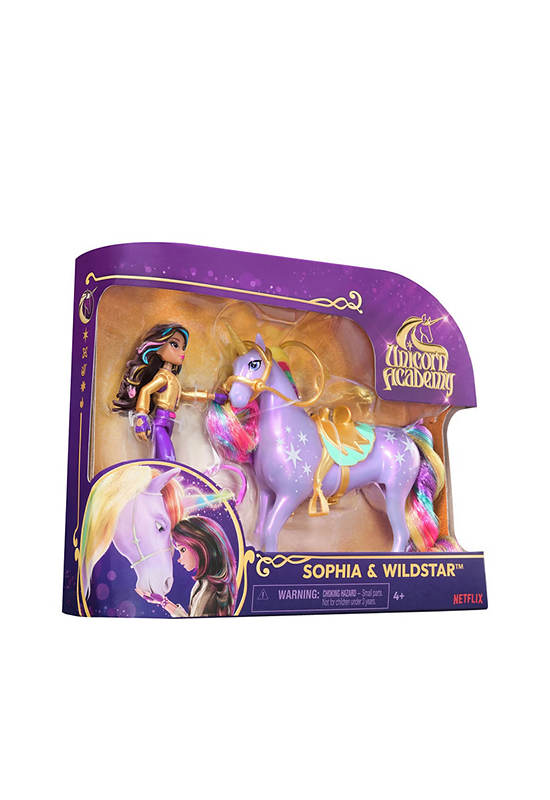 The UNICORN ACADEMY Sophia & Wildstar set, inspired by the popular NETFLIX show and best-selling books, sparks endless pretend play adventures! The 4.5” Sophia doll with 7 points of articulation pairs perfectly with the 5” Wildstar unicorn, featuring Light Magic details and a removable saddle and bridle.