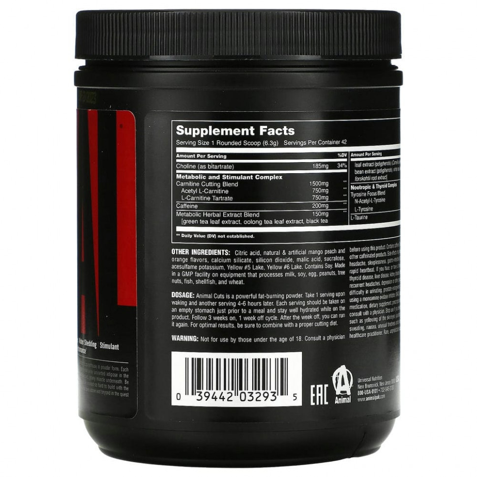 ANIMAL CUTS Animal Cuts — это мощный метаболический продукт в виде порошка. Каждая точно подобранная доза поможет избавиться от нежелательного жира в межсезонье, чтобы обнажить твердые, зернистые мышцы. Будьте чудаком и станьте чудаком, над которым вы так усердно работали, с помощью универсального режущего порошка, который поможет вам добиться большего.