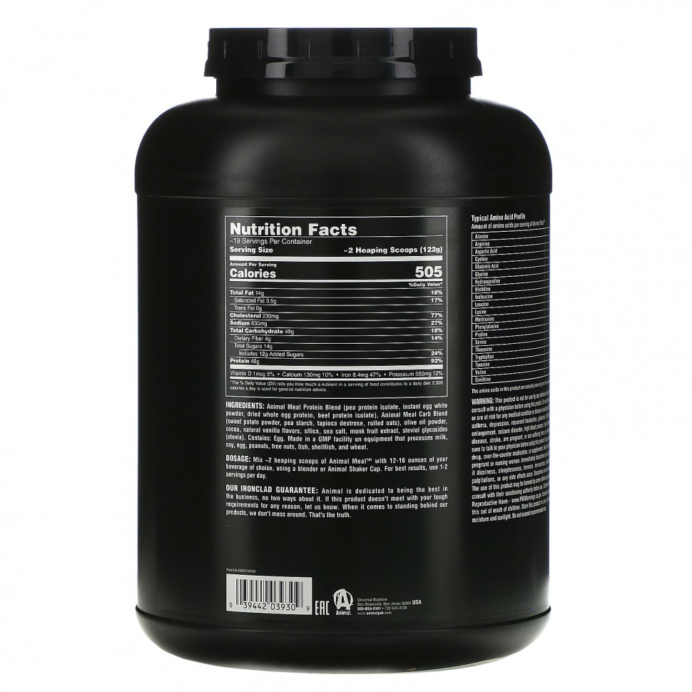 О компании. В 1983 году компания Animal была основана одновременно с созданием Animal Pak — растительных спортивных добавок в пакетиках, с которых все и началось. Компания Animal учитывала реальные потребности и желания профессиональных бодибилдеров и за несколько десятилетий выросла до огромных размеров. Название Animal на упаковке обозначает доверие, честность и уникальный подход без путаницы. Animal также представляет набор продуктов, которые выдержали испытание временем, снова и снова проверялись в лабораториях, в полевых условиях, и, что важнее всего, в тренажерном зале и на сцене. Компания Animal, взявшая на себя обязательства по созданию серьезного питания для серьезных спортсменов, — это правильный выбор в сфере комплексных спортивных добавок. Animal. Выбор чемпионов. Что такое Animal Meal Animal Meal — это высококачественный заменитель пищи, в котором используются простые полезные ингредиенты на основе пищевых продуктов, отобранные благодаря тому, что легко усваиваются и обеспечивают сбалансированное и экологичное питание. Созданный без каких-либо искусственных красителей, ароматизаторов, подсластителей или консервантов, Animal Meal можно употреблять в любое время в течение дня вместо еды или во время.