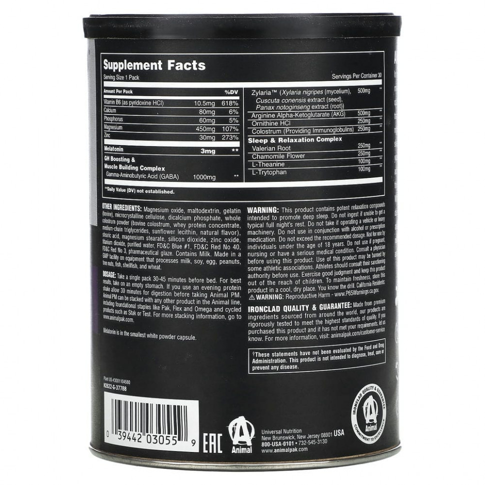 О нас. Рождение бренда Animal в 1983 году было ознаменовано появлением Animal Pak — эффективного тренировочного комплекса, который заложил основы будущего развития. Появившись в ответ на запросы и потребности профессиональных бодибилдеров, бренд Animal за эти десятилетия невероятно вырос. На протяжении вот уже многих лет название бренда ассоциируется с доверием, честностью и серьезным подходом к делу. Animal представляет линейку продуктов, которые выдержали испытание временем, постоянно доказывая свою эффективность как в научных лабораториях, так и в спортивных залах, что важнее всего. Создано для людей с интенсивной физической активностью, которые серьезно относятся к питанию. Animal — это лучший выбор в категории полноценных, комплексных добавок. Animal. Выбор чемпионов. Что такое Animal PM®? R&R. Да, это название игры. Ваша результативность определяется тем, насколько быстро и эффективно вы восстанавливаетесь. Можно тренироваться вполсилы или работать на пределе своих возможностей. В любом случае прогресс будет зависеть от того, насколько хорошо восстанавливается организм в период между тренировками. Для достижения ваших целей абсолютно необходимы сон и правильное питание в положенное время. Animal PM вам в этом поможет. Интенсивные тренировки в тренажерном зале утомляют и истощают организм. С помощью Animal PM можно превратить время между тренировками не просто в отдых, а в период интенсивного роста. Если вы хотите увеличить защитные возможности организма, хотите развиваться, накапливая силы, воспользуйтесь эффективным продуктом Animal PM.