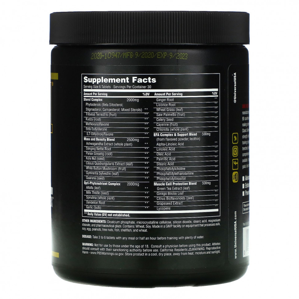 О нас. Мы — семейная компания, основанная в 1977 году, которая разрабатывает и производит проверенные питательные продукты для заядлых приверженцев физической активности. Наша продукция представлена более чем в 90 странах мира. Линейка Classic Series. С 70-х годов мы занимаемся созданием лучших питательных продуктов для бодибилдеров мирового уровня. Новая линейка Classic Series по-прежнему олицетворяет нашу постоянную приверженность людям, которые стремятся достичь силы и совершенства в тренажерном зале. Комплекс натуральных стеролов Эффективность комплекса природных стеролов Universal’s Natural Sterol Complex™, разработанных для серьезных тренировок, доказана на протяжении десятилетий опытными силовыми атлетами. Сегодня Natural Sterol Complex™ содержит комплексную формулу самых эффективных доступных стеролов, фитонутриентов и фитохимических веществ. Если вы ищете более натуральную добавку, которая поможет вам достичь своих целей в построении сухой мышечной массы, тогда вы уже нашли ее — Natural Sterol Complex™.