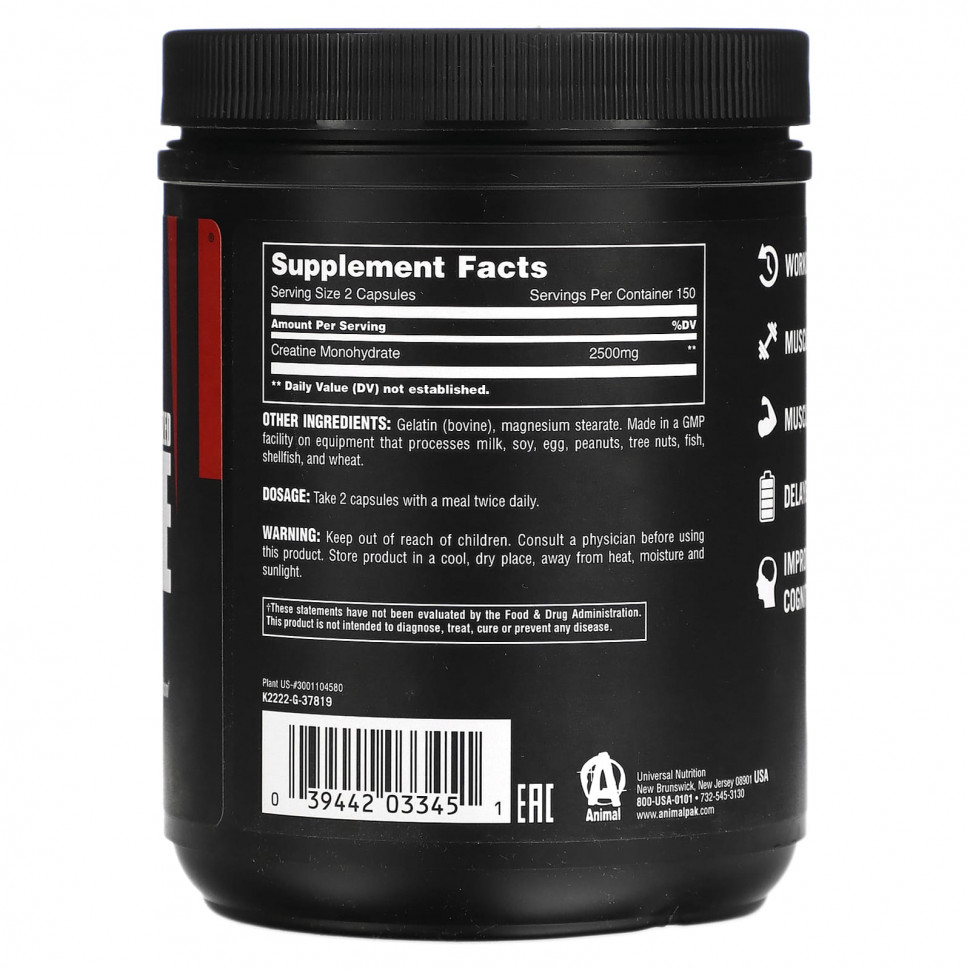 Сосредоточьтесь на тяжелой работе, зная, что с Animal Creatine вы сможете восстановиться. Он содержит наиболее легко усваиваемый моногидрат креатина. Креатин питает мышцы, обеспечивая высокоэнергетическую связь в мышцах и нервной ткани для поддержания уровня АТФ во время мышечного сокращения. Клинические исследования показали, что повышенный уровень креатина в организме также способствует оптимальному восстановлению после тренировок, ускоряет рост сухой мышечной массы и отсрочивает наступление мышечной усталости.