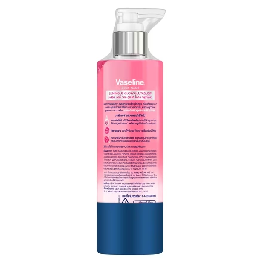 VASELINE BODY WASH LUMINOUS GLOW GLUTAGLOW — First time innovation of Skincleansing that come in serum texture Powered by GLUTAGLOWTM exclusive Formula From Vaseline. Get the Power of GlutaGlow to elevate Brighten and Glowing skin -GlutaGlowTM Technology with 10X Niacinamide and Glutathione that help brighten and even skin tone and Hyaluron help the skin look dewy, as if adding water to the skin. — Combined with a fruity aroma Sweet and mellow from freesia flowers. Add freshness with the scent of raspberry. — 10 times when comparing the amount of niacinamide with Vaseline Body Wash Healthy Bright. — Satisfaction test results on 236 volunteers in July 2009 by Synovate China when used regularly. Results depend on each individual's skin condition. Cosmetics cannot change the natural color of your skin.