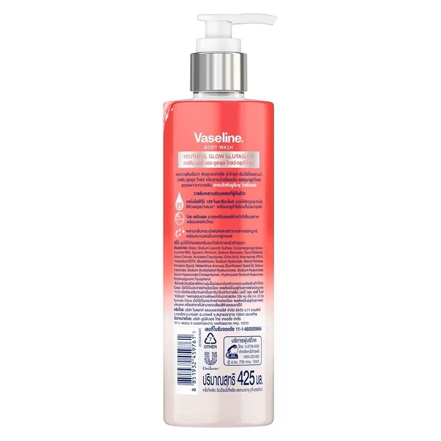 Vaseline Body Wash Youthful Glow Glutaglow GlutaGlowTM Technology with 10X Niacinamide for radiant skin, even skin tone, and a glowing appearance. Enriched with Glutathione for Skin Nourishment. Blended with a fragrance filled with charm and grace from muguet, along with the freshness of jasmine and pear. — Nourishing and youthful skin — 10X Niacinamide, Pro-Retinol — Pro-Retinol helps shed old skin cells and promotes skin cell renewal. Indulge now lather your body by rubbing before washing off. Vaseline Body Wash Youthful Glow Glutaglow Gluta Glow Technology with 10X Niacinamide for radiant skin, even skin tone, and a glowing appearance. Enriched with Glutathione for Skin Nourishment.