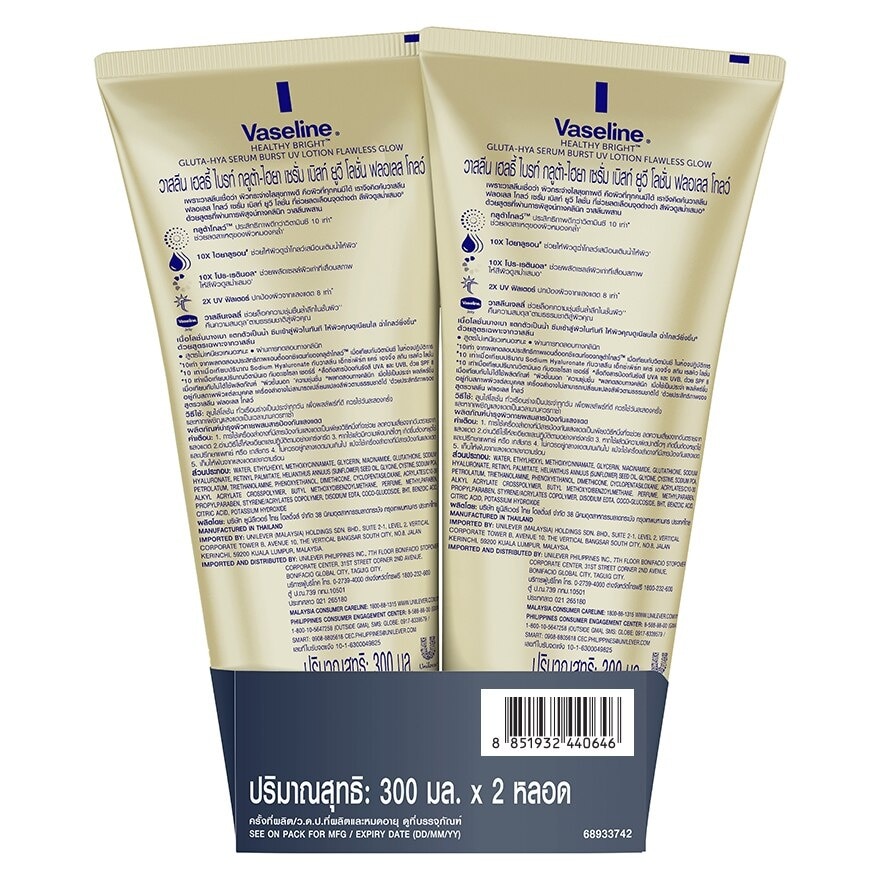 Vaseline Healthy Bright Gluta-Hya Serum Burst UV Lotion Flawless Glow — Boosted with GlutaGlow technology, that is 10x+ more powerful than Vitamin C. Vaseline also helps to reduce the cause of dullness. — 10x Hyaluron instantly boost skins moisture for dewy skin — 10x Pro-Retinol skin booster, Vaseline helps reduce discoloration, improve skin moisture and speed up skin turnover for even-toned skin — Vaseline Healing Jelly locks moisture deep within, restoring skins natural balance. Our unique formula bursts into water droplets and is instantly absorbed upon application. Experience skin that is more flawless and glowing. — Clinically proven — Lightweight, Non-sticky formula.