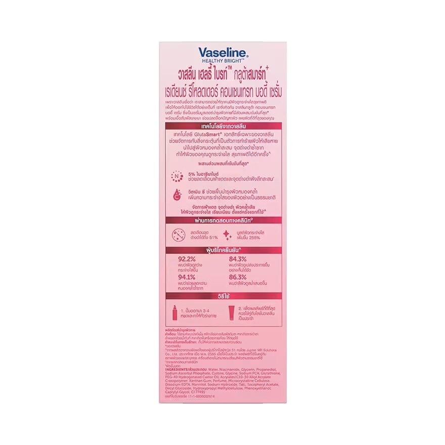 We at Vaseline believe in giving every body healthy skin so that people can live without limits. So we created the GlutaSmart Concentrate Body Serums, our first potent amp; lightweight body serums that help you unlock your best skin yet. OUR TECHNOLOGY Our exclusive and breakthrough, proprietary GlutaSmart Technology tackles damaging free-radicals that lead to oxidative stress and dull skin, enhancing it to give a healthy radiance. Featuring the highest concentration potent body care actives 5 NIACINAMIDE reduces deep blemishes interrupts the creation of reoccurring dark spots VITAMIN C revives dull skin and boosts skin's luminosity to reveal a natural inner glow Experience a crystal clear, visible glow from 1st use