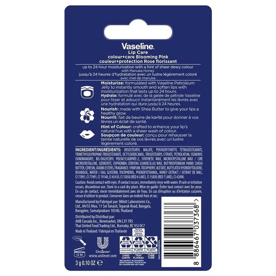 Vaseline Lip Color plus Care gives your lips a dewy & plumping colour with ultra-moisturizing colour lip balm. Contains 150 years heritage of original Vaseline Protecting Jelly (VPJ) and Shea butter & Manuka honey (extra moisturization) to keep your lips moisturized for all day long. With a subtle of Blooming Pink colors and natural glow even with multiple application. 24hr skin moisture tested, clinically skin patch tested. Can be freely re-applied many times a day and leave nice color, effortless make up look.