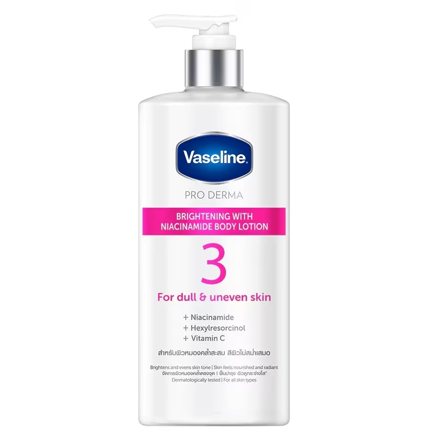 VASELINE PRO DERMA BRIGHTENING WITH NIACINAMIDE BODY LOTION A Highly concentrated serum lotion that combines 5% Niacinamide, Hexylresorcinol and Vitamin C to deeply brightens skin for a nourished radiance. 1. Repair: Prebiotics Repairing Essence combined with Vaseline Jelly, to help promote microbiome balance on skin. 2. Enhance: Infused with 99% pure Niacinamide, boosted with Hexylresorcinol and Vitamin C, to brighten stubborn, dull and blemished skin for an even skin tone. -Brightens uneven and dull skin, for soft and glowing skin.