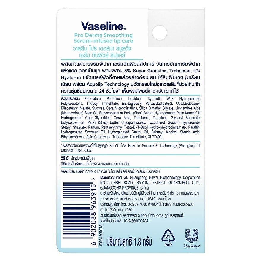 Vaseline Pro Derma Smoothing Serum infused lip care targeting dry peeled-off lip with 5 Sugar Granules Trehalose and Hyaluron Gently exfoliate dead skins for smoothen lips Aqualip Technology restore moisture deep for 24H See result in first use Satisfactory survey with 80 women by How To Science amp; Technology (Shianghai) LT China April 2022 Vaseline Pro Derma Smoothing Serum-infused lip care targeting dry, peeled off lip with 5 Sugar Granules Trehalose and Hyaluron. Gently exfoliate dead skins for smoothen lips Aqualip Technology restore moisture deep for 24H See result in first use