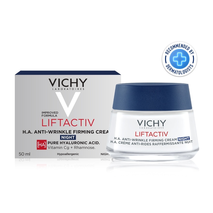 Vichy Liftactiv Supreme Range has undergone an upgrade, Discover the improved look and formula of Liftactiv H.A. Anti Wrinkle Firming Night Cream, designed to help you achieve skin firming results and look even better on your nightstand. This rich moisturising cream reduces the appearance of wrinkles, nourishes skin, and enhances a helthy looking glow. With a non-greasy, non-sticky velvety texture, helping you to wake up to smoother, softer skin, and a long lasting lifted feel.