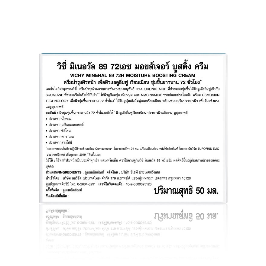 Vichy Mineral 89 72H Moisture Boosting Cream 50 ml. Our most loved, cultstatus Mineral 89 Serum now has a cream format to add to your daily skincare routine. Boost your skins daily hydration levels and strengthen your skin barrier with Vichy's Mineral 89 72 Hour Moisture Boosting Cream. Formulated cream with Hyaluronic Acid, Vitamins E and B3 as well as Squalane, this refreshing cream texture melts into skin for an instant hydration boost and locks in moisture for long-lasting skin nourishment. Leaves skin looking replumped and feeling soothed and supple for a glowing, healthy looking complexion. Tested on sensitive skin with normal to damaged skin barriers, suitable for all skin types and tones. Hypoallergenic skincare. Fragrance Free skincare. Apply following your Mineral 89 Serum for a double hit of hydration and skin strength.