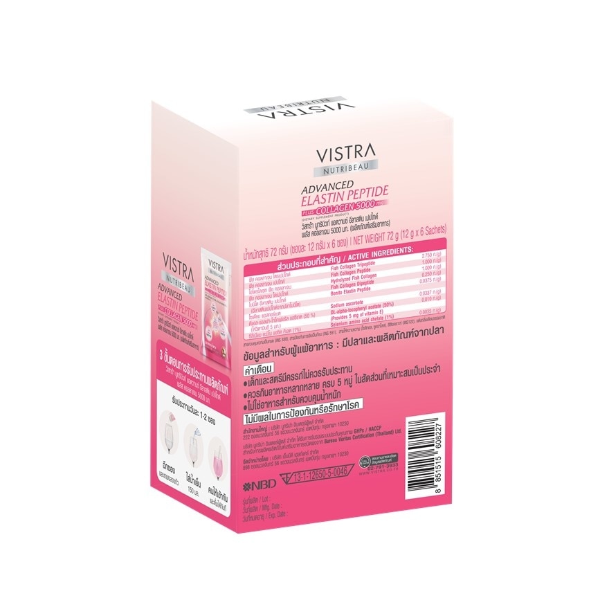 Vistra Nutribeau Advanced Elastin Plus Collagen 5000 mg. 6 Sachets Allergy information : contains collagen from fish Children and pregnant woman should not eat. Always read the label warning before use. No effect on prevention or treatment of diseases. Should routinely eat appropriate proportion of varieties of 5 food groups.