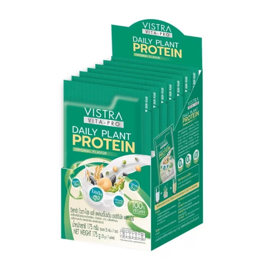 Vistra Vita Pro Daily Plant Protein Original Flavor. Cautions: Allergy information : Contains Soy and Gulten Children and pregnant woman should not eat. Always read the label warning before use. No effect on prevention or treatment of diseases. Should routinely eat appropriate proportion of varieties of 5 food groups.