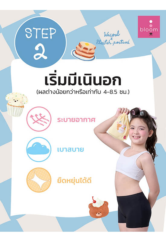Wacoal Bloom Step 2 bra for girls, plain style, cotton fabric, stretchy, soft, comfortable, does not irritate the skin. The inner chest area is lined with thin synthetic fiber foam, extra soft to the touch. The shape is pull-on, U-back, worn to cover the chest area where the shape and base of the cup begin to expand, creating confidence without being too revealing.