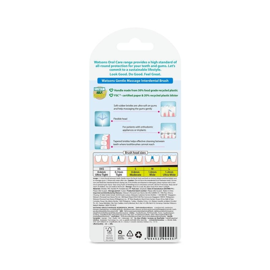 Watsons Oral Care range provides a high standard of all-round protection for your teeth and gums. Watsons Gentle Massage Interdental Brush for brush head size S-L (0.8 – 1.2 mm) 26 pcs. Soft rubber bristles are ultra-soft on gums and help massaging the gums gently. Flexible head and suitable for patients with orthodontic appliances or implants. Tapered bristles help effective cleaning between teeth where toothbrushes cannot reach.