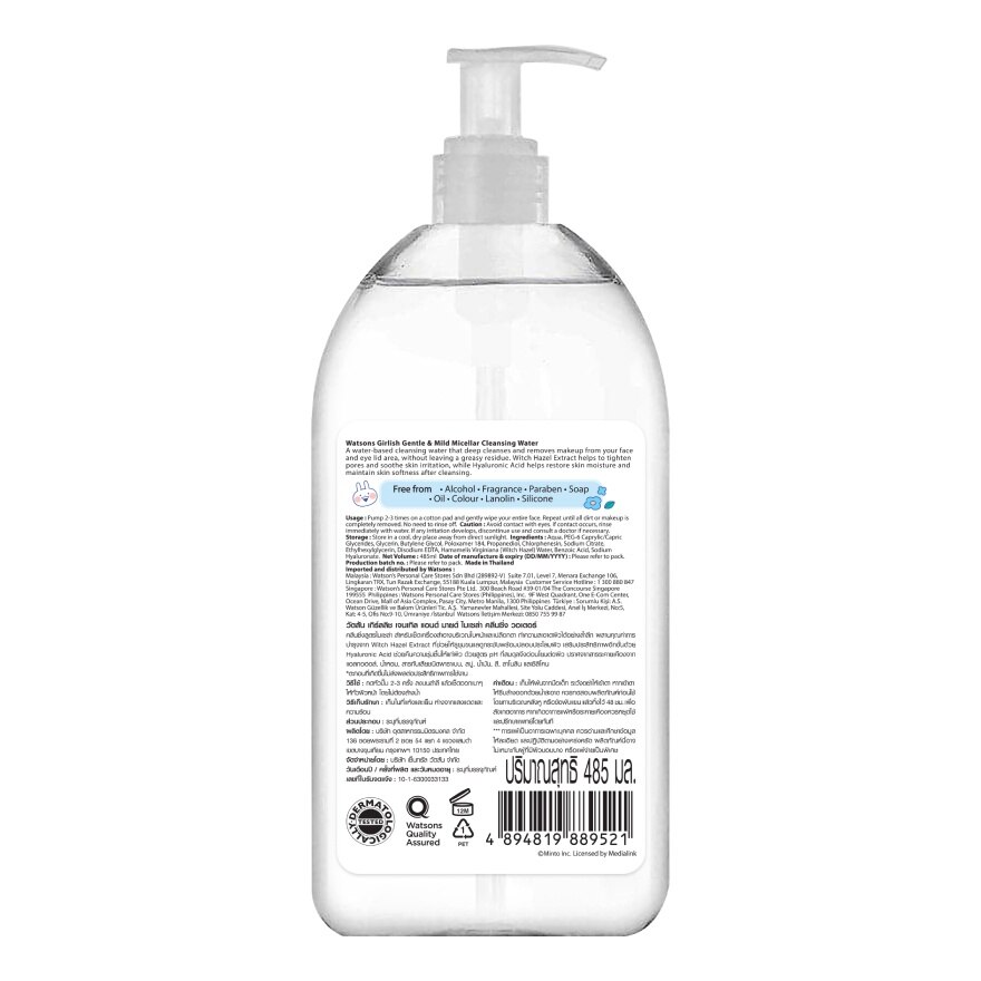 Watsons Girlish Gentle & Mild Micellar Cleansing Water A water-based cleansing water that deep cleanses and removes makeup from your face and eye lid area, without leaving a greasy residue. Witch Hazel Extract helps to tighten pores and soothe skin irritation, while Hyaluronic Acid helps restore skin moisture and maintain skin softness after cleansing.Ingredient you can trust with a reduced environmental impact.This product was formulated without over 20 unwanted ingredients.Additionally, out of the total palm oil /derivatives, this formulation contains more than 50% of certified sustainable palm oil/derivatives.